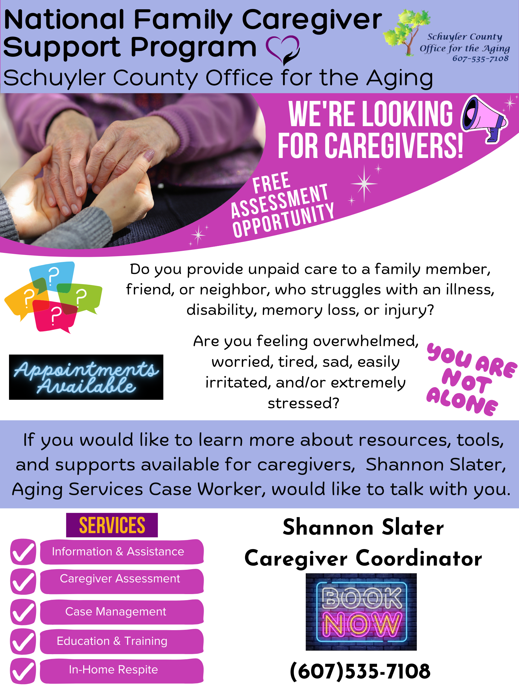 to any of the questions above, you are eligible for the National Family Caregiver Support Program (NFCSP). The goal of the NFCSP is to support family caregivers so they may continue to carry out their caregiving roles and responsibilities. The program can provide services such as caregiver counseling, information and assistance, caregiver training, respite care (a break from caregiving), and much more. If you would like to learn more about how this program can assist you, please contact Shannon Slater, Aging Services Case Worker, 607-535-7108.